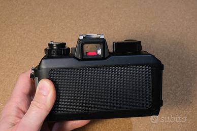 Il corpo macchina è in buono stato estetico e meccanico ed è perfettamente funzionante. È stata testata sotto la pioggia e ha prodotto delle fotografie ben esposte.