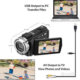 ?Incredibilmente facile da usare questa videocamera? Usa il cavo USB incluso per caricare la videocamera per 2 ore per iniziare a scattare foto e video con 1080p. Questa videocamera supporta schede SD/SDHC standard (fino a 128 GB, non incluse) e supporta il treppiede standard da 1/4'' (non incluso). La scheda SD deve essere formattata prima dell'uso.