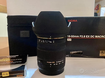 Obbiettivo Sigma 18-50 F2.8 Ex Dc Macro Canon. Obbiettivo sigma eccellente attacco canon tuttofare con apertura focale 2.8 fissa ottimo in low light e straordinario in nitidezza obbiettivo in ottime condizioni e perfettamente funzionante corredato di tutto scatola originale manuali paraluce originale tappi e borsetta per il trasporto. Per attacco ef aps.c, non va per le fullframe EF. Prezzo poco trattabile.
