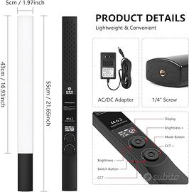 360° Full Color RGB Led Light Stick: RGB Hue da (0 ~ 360 °), realizzato con 370 perline LED [50 pezzi RGB + 320 pezzi bianco caldo a due colori]. Caratteristiche temperatura di colore regolabile che varia da 2500K (caldo) - 8500K (freddo), livelli di luminosità di regolazione continua (0%-100%). Illuminazione fino a 2800Lux (0.5m) e ha una durata di oltre 50000 ore con eccellente dissipazione del calore. Utilizzare perline della lampada indice, CRI> 97, TLCI>96, adatto per foto creative di prodotti, produzione di film atmosferici, ritratti artistici e video live streaming.