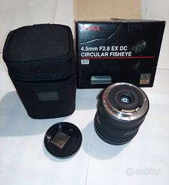 Vendo obiettivo 4,5 mm f2,8 ex DC fisheye circular Sigma SLD PER CANON, nuovo, in confezione originale, perfetto e mai usato, tranne test iniziale.