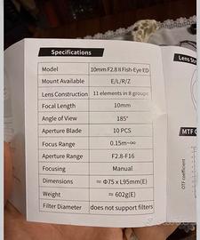 7artisans Obiettivo F2.8 II Full Frame ultra grandangolare Fisheye da 10 mm con messa a fuoco manuale a 185°. Usato 2 volte sulla mirrorless Sony Alpha A7 IV. Lo vendo per inutilizzo. Scatola e custodia originale. Spedizione a carico del compratore.