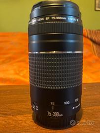 Praticamente mai usato, come nuovo attacco EOS EF; questo teleobiettivo zoom è adatto a vari stili fotografici. Grazie alla struttura leggera e compatta può essere portato ovunque ed è quindi perfetto per i viaggi. L'ampia portata focale permette di immortalare soggetti distanti e realizzare ritratti. L'obiettivo zoom EF 75-300mm f/4-5.6 III, facile da utilizzare, è dotato di un motore integrato, per prestazioni di messa a fuoco rapide, e di un diaframma elettromagnetico per un posizionamento dell'apertura estremamente preciso.