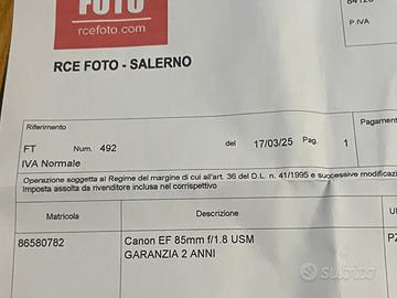 Come da titolo vendo magnifico obiettivo Canon EF 85mm f/1.8 USM, acquistato a Marzo 2025 presso RCE FOTO SALERNO e utilizzato per soli 110 scatti (dal momento dell'acquisto).