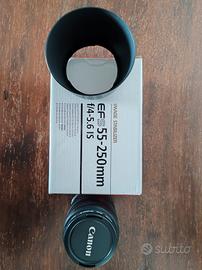 Vendo obiettivo Canon EF-S 55-250 completo di paraluce originale Canon e scatola. Condizioni perfette, nessun graffio, sempre usato con filtro UV.