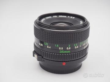 Obiettivo vintage Canon NewFD 35mm f/2.8 in ottime condizioni, lenti senza graffi nè muffe, barilotto impeccabile. Le ghiere sono fluide e i diaframmi funzionano perfettamente. Entrambi i tappi sono originali , regalo filtro skylight a protezione della lente anteriore. Comprensivo di astuccio.