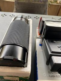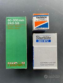 Accessori per macchina fotografica analogica Canon/Yashica: Naigon Zoom Macro Multicoated 60-300mm f/4.0-5.6, con scatola. Tamron - 2X tele-converter f-system. Duplicatore focale, con custodia originale e scatola. Flash Starblitz modello 320 BTZ, con scatola. #macchinafotograficavintage #macchinaanalogica #yashica #canon