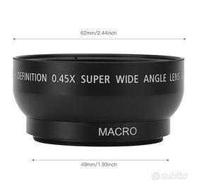 Obiettivo grandangolare da 49 mm, ingrandimento 0,45x, adatto per fotocamere e obiettivi fotografici.