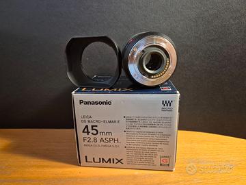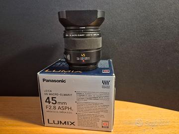Obiettivo panasonic leica 45 mm f 2.8 macro completo di scatola paraluce tappi usato pochissimo .