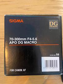 Vendo per inutilizzo Obiettivo macro Sigma, 70-300mm F4-5.6 APO DG MACRO con attacco Canon. Completo di scatola, custodia, paraluce, coperchio frontale e posteriore, tutto originale. Usato pochissimo, come nuovo.