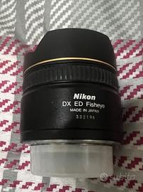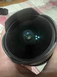 Obiettivo Nikkor Nikon AF 10.5 mm f 2.8 G ED DX Fisheye in ottime condizioni , privo di graffi e/o muffe, con tappo frontale e posteriore . Caratteristiche Ottiche Focale10.5 mm Angolo di campo180° (equivalente a un 16mm in formato Fullframe 24x36mm) FormatoAPS-C Diaframma Max.f/2.8 Lamelle diaframma7 Lenti/Gruppi10 elementi in 7 gruppi Min. distanza fuoco0.14 metri Rapporto riproduzione0.20x Funzionalità StabilizzazioneNo Messa a fuocoMotore AF della reflex Messa a fuoco internaSi Costruzione e note Anello treppiedeNo MoltiplicatoriNon compatibile ParaluceIncorporato TropicalizzazioneNo Peso300 g Dimensioni63 x 63 mm Purtroppo non ho più la scatola