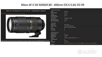 Vendo obiettivo Nikon AF-S DX NIKKOR 80 - 400mm f/4.5-5.6G ED VR stabilizzato.