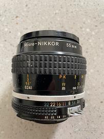 Obiettivo Nikon Micro-NIKKOR 55 mm, 1:3.5. Piccoli difetti su lenti. In omaggio corpo macchina Nikon EL 2 + filtro UV
