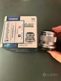 Obiettivo olympus 45mm f1.8 per siatema m4/3. Perfettamente funzionante senza strisci e segni di usura.