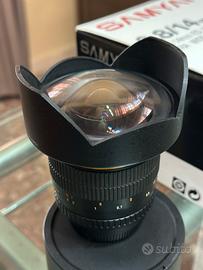 Vendo SAMYANG 14mm F2.8 ED AS IF UMC con attacco Nikon F. Completo di scatola, astuccio e tappi originali. Comprato nuovo, usato pochissimo. In ottimo stato.