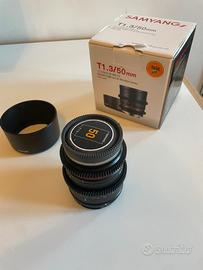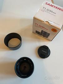 Vendo obiettivo Cine Samyang 50mm T/1.3 AS UMC CS per fotocamere APS‑C mirrorless, completo di tappi, paraluce e scatola originale.