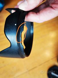 Usato, difetti: il paralume e rotto in un piccolo punto come da foto, ma si aggancia benissimo all'obiettivo. Inoltre quando si ruota lo zoom ha un punto più duro in cui si blocca un po' ma poi ruota completamente. La plastica ruvida che lo ricopre ha dei punti un poco più chiari. Ma le lenti sono ottime e fa ottime fotografie.