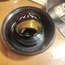 L'Olympus Zuiko MC Macro 20mm f/3.5 è un obiettivo macro altamente specialistico progettato per la macrofotografia a forti ingrandimenti, tipicamente tra 4x e 12x. Nuovo con scatola campana ed istruzioni Caratteristiche Principali Design per Soffietto: Non possiede un meccanismo di messa a fuoco interno (elicoidale) e deve essere utilizzato obbligatoriamente con un soffietto (Auto Bellows) o tubi di estensione telescopici. Attacco RMS: Utilizza una filettatura RMS (Royal Microscopical Society) da 0,8 pollici, lo stesso standard di molti obiettivi per microscopio. Per montarlo su fotocamere Olympus OM, è necessario l'adattatore PM-MTob. Ottica: Composto da 4 elementi in 3 gruppi. La sigla "MC" indica il trattamento Multi-Coating, introdotto nelle versioni successive per ridurre riflessi e ghosting. Diaframma: Completamente manuale e a variazione continua (senza scatti/click-stops). La scala dei diaframmi appare capovolta se vista da dietro la fotocamera, poiché l'obiettivo era pensato per l'uso su stativi da riproduzione rivolti verso il basso. Specifiche Tecniche Apertura: f/3.5 – f/16. Ingrandimento: Ottimizzato per un range da 4:1 a 12:1. Peso e Dimensioni: Estremamente compatto e leggero, pesa circa 70g ed è lungo solo 20mm. Filtri: Non ha una filettatura standard; utilizza filtri "slide-on" da 21mm. Utilizzo e Prestazioni Data l'altissima capacità di ingrandimento, è ideale per fotografare soggetti minuscoli come circuiti integrati o piccoli dettagli biologici. Poiché il diaframma è manuale, la misurazione dell'esposizione deve avvenire in modalità stop-down (chiudendo il diaframma al valore desiderato prima dello scatto). Adattabile su mirrorles e digitali in genere con opportuno adattatore
