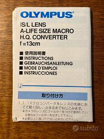Convertitore macro Olympus IS/L LENS A-LIFE SIZE MACRO H.Q. (f=13cm), pezzo originale vintage nuovo, mai utilizzato, senza graffi. Diametro filettatura 49mm.