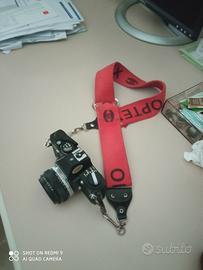 con obiettivo Zuiko 50 mm tracolla e flash Maxwell 303 H