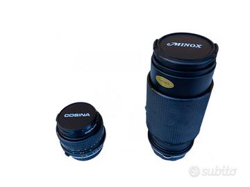 Olympus OM 101 con obiettivo 35 70 mm e flash. Obiettivo grandangolare 24 mm.Obiettivo zoom 70 220 mm e borsa