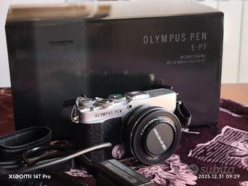 Vendo una fotocamera mirrorless micro 4/3 della Olympus OM System, modello e-p7 con Power zoom 14-42mm che rappresenta l'obiettivo kit del sistema.