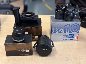 Vendo Olympus OM 10 Quartz nuova funzionante con scatola più Winder due OM con scatola e obiettivo Zico Emmeci Auto macro 50 mm F3.5 con porta obiettivo compreso e cinta la lega macchinetta.