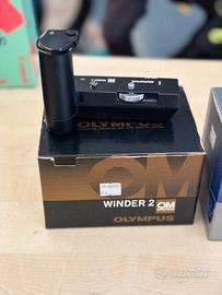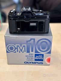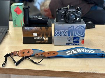 Vendo Olympus OM 10 Quartz nuova funzionante con scatola più Winder due OM con scatola e obiettivo Zico Emmeci Auto macro 50 mm F3.5 con porta obiettivo compreso e cinta la lega macchinetta.