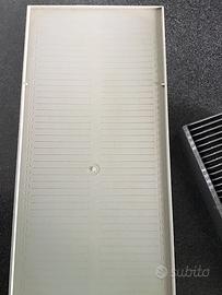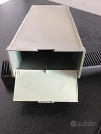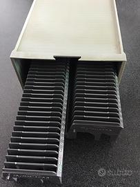 Box per diapositive con 2 caricatori per 50 diapositive (per ogni caricatore)vintage Box contenitore “VINTAGE” in plastica per n.2 carrelli porta diapositive da 50 pz ciascuno ,formato 24x36 pronti da inserire nel proprio proiettore a carrelli lineari. Naturalmente impilabili. Sono i contenitori di una raccolta dismessa di diapositive degli anni '70/80’,quindi usati ma tutti perfettamente conservati e funzionanti. Essendo stati acquistati in diversi anni, i colori variano da grigio chiaro a grigio scuro. Dimensioni: Lunghezza: Circa 300 mm Larghezza: Circa 124 mm Altezza: Circa 65 mm Peso incl. caricatori: Circa 500 g La quantità disponibile è di 9 pezzi. Vendo singolarmente a 5€ al pezzo esclusa spedizione.