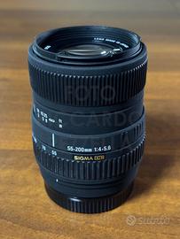 Vendo ottica, marca Sigma, mod. 55-200mm F4-5.6 DC, per fotocamere Sony APS-C, attacco A-mount, colore nero, completo di scatola ed accessori originali Sigma (tappo, paraluce, istruzioni per l'uso), Sigma Corporation, made in Japan, con le seguenti caratteristiche: