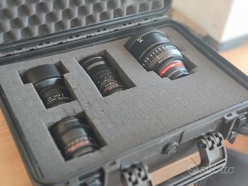 vendo valigetta composta da 4 ottiche cinematografiche Samyang 14mm 3.1t Xeen 24mm 1.5t Walimex 35mm 1.5t Samyang 85mm 1.5t compresa valigetta