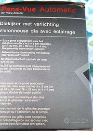 Impila e visualizza fino a 36 diapositive. Funzionamento semplice push-pull. Schermo quadrato da 2-5/8 pollici. Ingrandimento 4x brillante. Illumina ogni diapositiva automaticamente tramite 2 batterie d (non incluse). Completo di scatola originale e lampadina di ricambio.