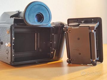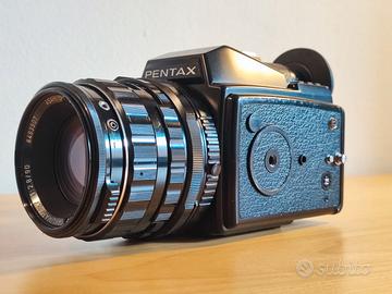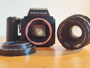 Vendo macchina fotografica analogica medio formato 6x4.5 Pentax 645 con adattatore per montare l'obiettivo Pentax 67 smc 90mm f2.8. Vendo completa di tappi corpo e obiettivo. Garanzia di 6 mesi data dal riparatore che ha revisionato e aggiustato la fotocamera. La fotocamera, quindi è stata testata e funziona perfettamente in tutte le sue funzioni. I tempi sono tarati come anche l'esposimetro. L'obiettivo è pulito, senza graffi o muffe (l'attacco a baionetta è adatto a tutti i modelli pentax 67 e con adattatore a modelli pentax 645 645n 645d 645z 645nii)
