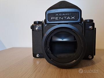 Vendo Asahi Pentax 6x7 con corpo e pentaprisma. Fotocamera analogica medio formato molto apprezzata, celebre per la resa del 6x7 e la costruzione solida, ideale sia per l’uso fotografico (paesaggio, ritratto, progetti artistici) sia come pezzo da collezione.