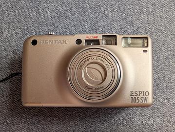 Macchina fotografica analogica Pentax Espio 105 SW perfetta, quasi nuova, completa di custodia e manuali. Facile e divertente compatta punta & scatta dotata di zoom 28-105mm, flash, autoscatto e modalità panorama.