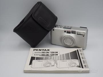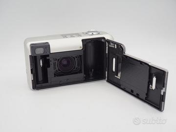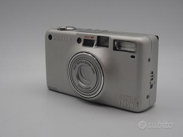 Macchina fotografica analogica compatta Pentax Espio 120 SW in buone condizioni, corpo in metallo e ottica 28-120 mm. Testata e funzionante, la lente si estende correttamente fino a 120mm, non presenta difetti. Le guarnizioni dello sportello posteriore sono ottime, il body presenta alcuni segni d'uso come visibile in foto. Il display funziona correttamente. Comprensiva di custodia originale, laccetto e libretto di istruzioni. Si alimenta con una batteria CR2 non inclusa.