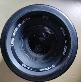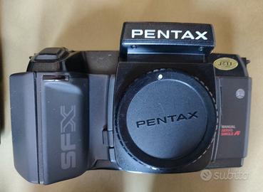 Bellissima fotocamera a rullino autofocus della Pentax con A2 obiettivi Sigma, 28-70e70-210, oltre a flash e pulsante di scatto dedicati. Tutto in ottime condizioni e perfettamente funzionante. Le scritte dello zoom 70-200 sono cancellate. Si regala borsa