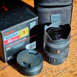 Sigma 8-16mm f/4.5-5.6 DC (zoom ultra-grandangolare, per Pentax APS-C ma compatibile con K1), comprensivo di confezione originale, paraluce, tappo anteriore, tappo posteriore, sacca di trasporto. Richiesta: 180 €.