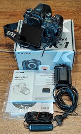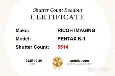 Vendo Pentax K-1 (versione mark 1), fotocamera digitale full frame. Tenuta molto bene, usata poco (5.514 scatti, corrispondente a meno del 2% della durata prevista dell'otturatore). Completa di scatola, libretto, cinghia, batteria Pentax D-LI90, caricabatterie Pentax D-BC90, FT Eyecup, tappo di protezione: tutto originale. Regalo telecomando per scatto remoto (a cavo). Solo corpo macchina: 990 €. Possibilità di abbinare i seguenti obiettivi.