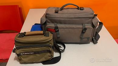 Oltre alla Pentax K10 D e obb. 18/35 prendete anche tutto quello che c’è in foto: borse/ obbiettivi / macchina fotografica a rullino Ricoh e obbiettivi.