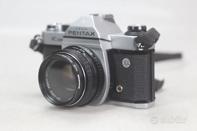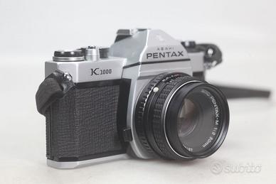 Iconica fotocamera analogica Pentax K 1000 completa di obbiettivo SMC Pentax M 50mm F/2. Ottime condizioni perfettamente funzionante. Completa di scatola e rara borsa originale in pelle.