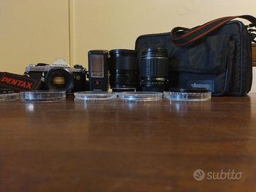 Pentax ME super in ottime condizioni con ottica 50 mm ottica 135 mm TAKUMAR ottica TARUMAN 28-70 mm flash OSRAM e 8 filtri vari per gli obiettivi sopracitati compresa la borsa VIVANCO il tutto in ottime condizioni come da foto vendita in blocco oppure separatamente su richiesta.