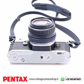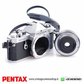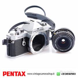 PENTAX MX Silver + PENTAX-M 28mm 1:3,5 fotocamera analogica 35 mm completamente meccanica, famosa per la sua affidabilità e compattezza, ideale per chi ama il controllo totale dello scatto e la fotografia tradizionale. L’abbinamento con l’obiettivo grandangolare 28 mm f/3.5 offre una visione ampia perfetta per paesaggi, street e reportage. Montatura Pentax-K/M, tutto in manuale con costruzione metallica di alta qualità.