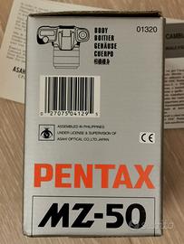 Vendo macchina fotografica reflex analogica (a pellicola!) Pentax MZ-50 autofocus con obiettivo Pentax 35-80 1:4-5.6. La macchina è stata usata pochissimo, pari al nuovo. Completa di scatola, documenti, tracolla.
