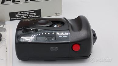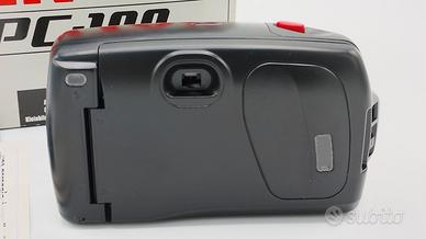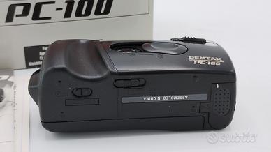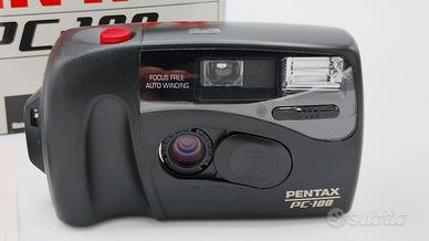 Fotocamera compatta punta e scatta. PENTAX PC 100 MACCHINA NUOVA MAI USATA. Completa di scatola originale con istruzioni, laccio da collo e sacchetto morbido. La macchina è stata testata con pellicola. Funziona con due normali batterie stilo AA.