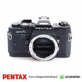 PENTAX SuperA Black Body (conosciuta come Super Program in alcuni mercati) è una reflex 35mm elettronica di fascia avanzata introdotta nei primi anni ’80. Compatta, leggera ma tecnologicamente evoluta per l’epoca, rappresenta uno dei modelli più completi del sistema Pentax K. Il corpo Black unisce estetica professionale e costruzione solida. È dotata di controllo esposimetrico multimodo: Programma (automatica), Priorità dei tempi (Tv), Priorità dei diaframmi (Av) e Manuale completo. L’otturatore elettronico a controllo verticale in metallo consente tempi fino a 1/2000 sec. Il mirino TTL offre informazioni complete tramite display LED laterale. Compatibile con ottiche a baionetta Pentax K (incluse serie KA per modalità Program), mantiene la possibilità di utilizzo anche con ottiche manuali K/M in stop-down. Macchina versatile, ideale per chi vuole controllo creativo totale in formato 35mm analogico.