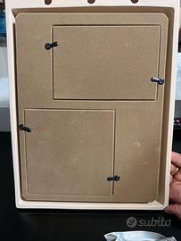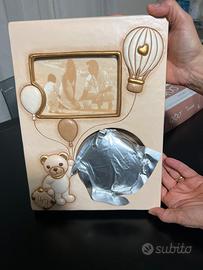 Trattasi di porta foto con zona rotonda con gel calco per manina bimbo mai utilizzata regalo non più necessario ma perfetta come nuova, senza scatola originale, ma con una simile misure 32x24