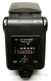 Flash Soligor MZ-30AT con parabola zoom da 35, 50 e 85 mm (N.G. 24-30 a 100 ISO), 2 diaframmi di lavoro in automatico a 100 ISO (F/2.8 ed F/5.6), slitta a contatto caldo e cavo sincro, spegnimento automatico, completo di manuale d'uso.