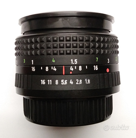 Obiettivo Prakticar 50 mm f/1.8 corredato da filtro UV 49 mm Optex e da custodia Reporter (con passante).