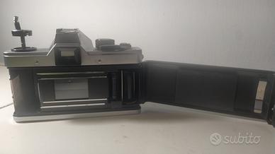 Fotocamera reflex analogica Praktica MTL5 con logo frontale d'importazione dalla Repubblica Democratica Tedesca (Germania Est).